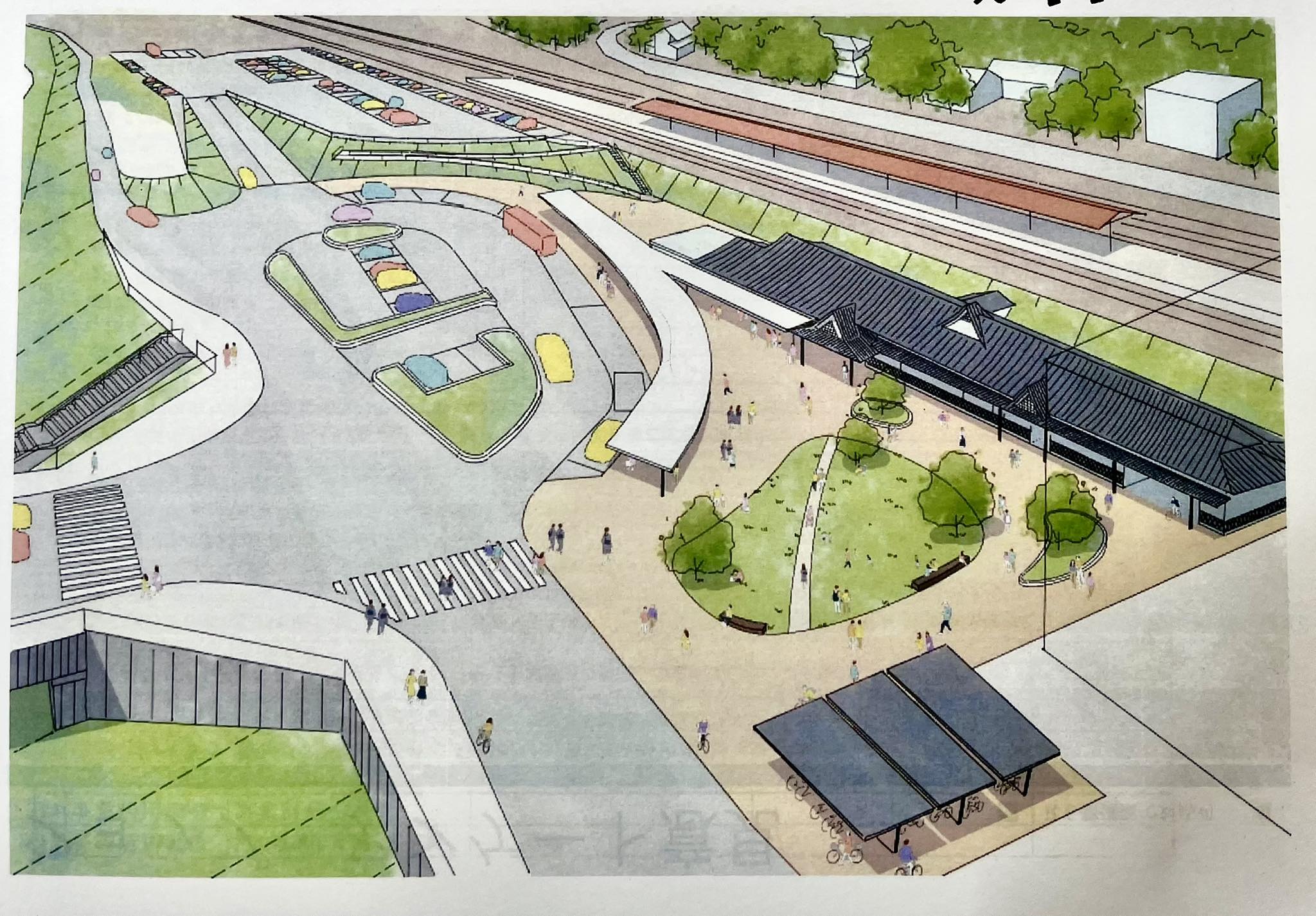 駅前広場に「交流スペース(木を植えた公園のような空間)」と