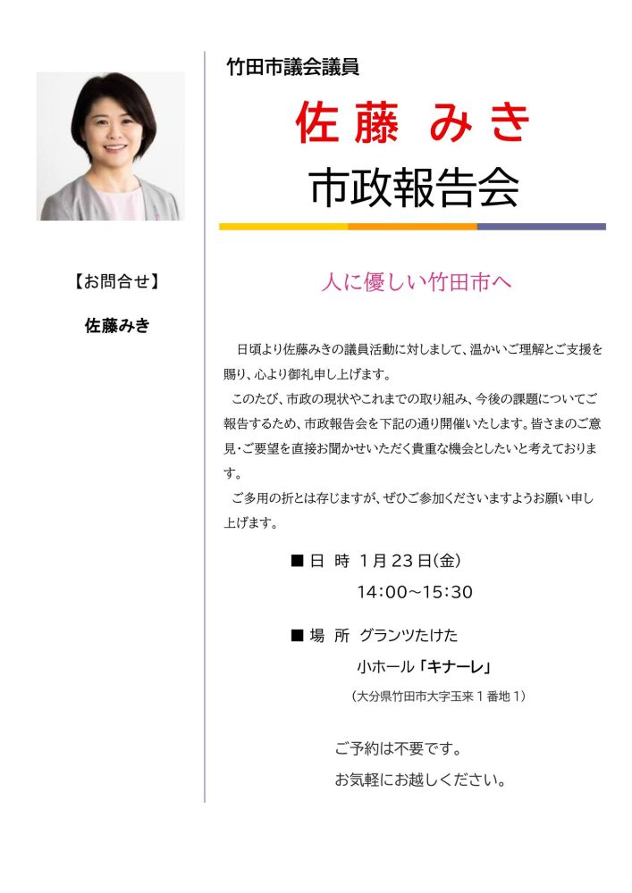 市政報告会のお知らせ 竹田市議会議員 佐藤みき